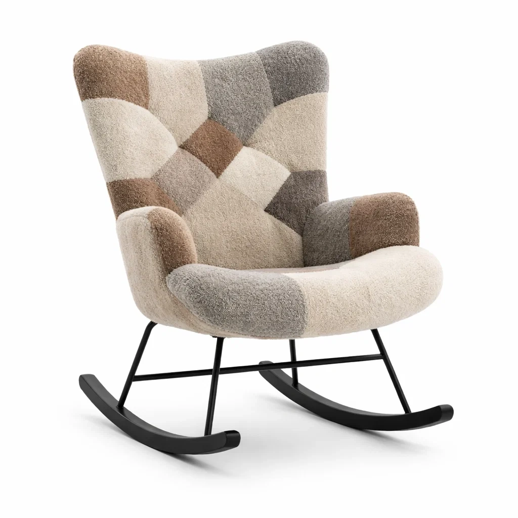 Dieser Schaukelstuhl verfügt über einen Bezug aus Bouclé-Stoff im Patchwork-Design in Beige, Braun und Grau. Der Rahmen besteht aus strapazierfähigem Metall für Stabilität. Die Gesamthöhe beträgt 105 cm, die Breite 75 cm und die Tiefe 80 cm. Der Stuhl ist für ein gleichmäßiges Gewichtslimit von 120 kg ausgelegt.